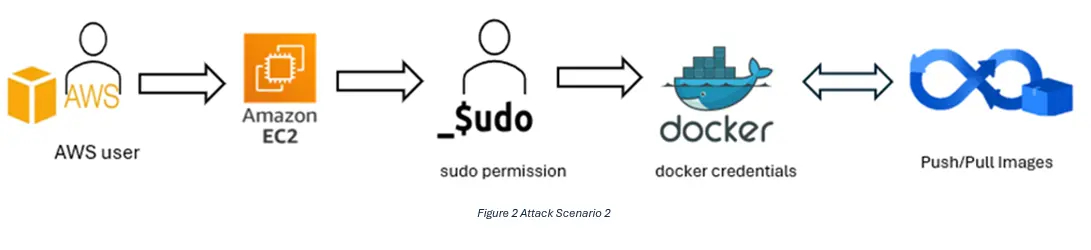 Chaining example (conceptual): exposed repo → obtain long-lived credentials → call AWS APIs to list cross-account roles/resources → use credentials found on an EC2 instance to access private registry → escalate to root on instance via passwordless sudo → pivot further.