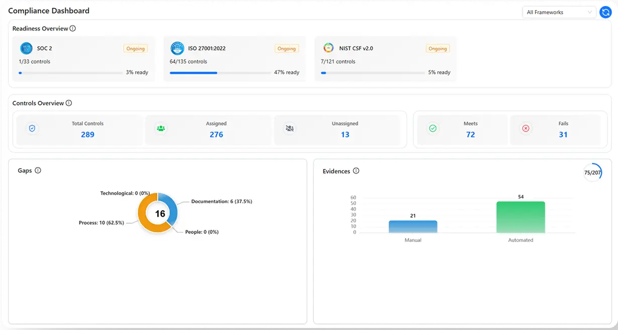 A. The platform streamlines control mapping, automates evidence collection, and provides continuous visibility into compliance status across all frameworks in one unified view.