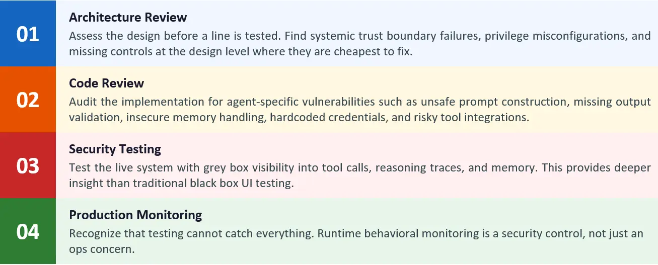 No security assessment is complete at deployment. Agentic systems face evolving attacks that testing alone cannot predict. Production monitoring is not just an operational task; it is a core security control.