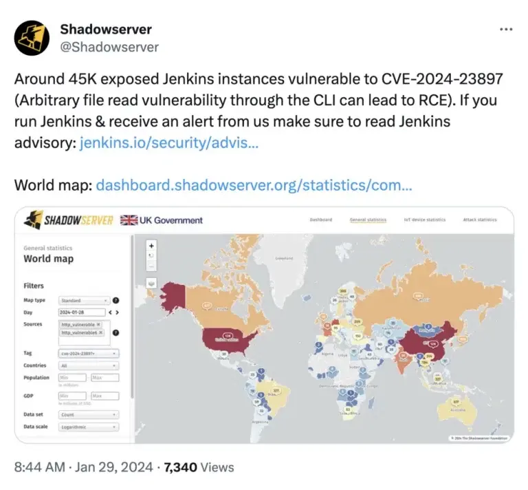 According to security researchers from ShadowServer, there are approximately 45,000 unpatched Jenkins instances, most of which are in China (12,000) and the United States (11,830).